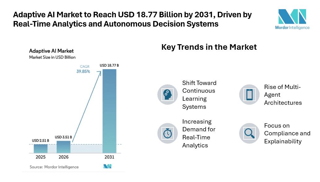 According to Mordor Intelligence, the adaptive AI market size is estimated at USD 3.51 billion in 2026, growing from USD 2.51 billion in 2025, and is projected to reach USD 18.77 billion by 2031, registering a CAGR of 39.85% during the forecast period. This rapid market growth reflects how organizations are prioritizing flexible and self-learning systems that can respond to real-time changes without constant manual updates. The market is gaining strong attention as businesses shift from static models to systems that can learn and adjust continuously.