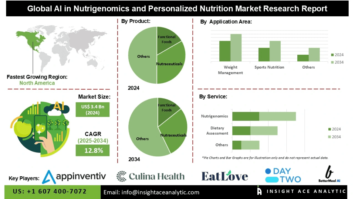 InsightAce Analytic Pvt. Ltd. announces the release of a market assessment report on theGlobal AI in Nutrigenomics and Personalized Nutrition Market Size, Share & Trends Analysis Report By Type of Product (Dietary Supplements (Vitamins, Minerals, Probiotics, Prebiotics, Botanicals, Proteins, Carbohydrates, and Fats), Functional Foods, and Nutraceuticals), By Type of Service (Dietary Assessment, Nutrigenomics, Personalized Meal Planning, Lifestyle Assessment, and Health Monitoring), By Type of Technology (Machine Learning, Natural Language Processing, Computer Vision, and Predictive Analytics), by Type of Component (Software, Hardware, and Services), By Application Area (Weight Management, Sports Nutrition, Digestive Health, Cognitive Health, and Immune Health), By Type of Device (Wearables, Smartphones, and Tablets), By Type of Deployment Mode (Cloud-Based, and On-Premises)-Market Outlook And Industry Analysis 2034″