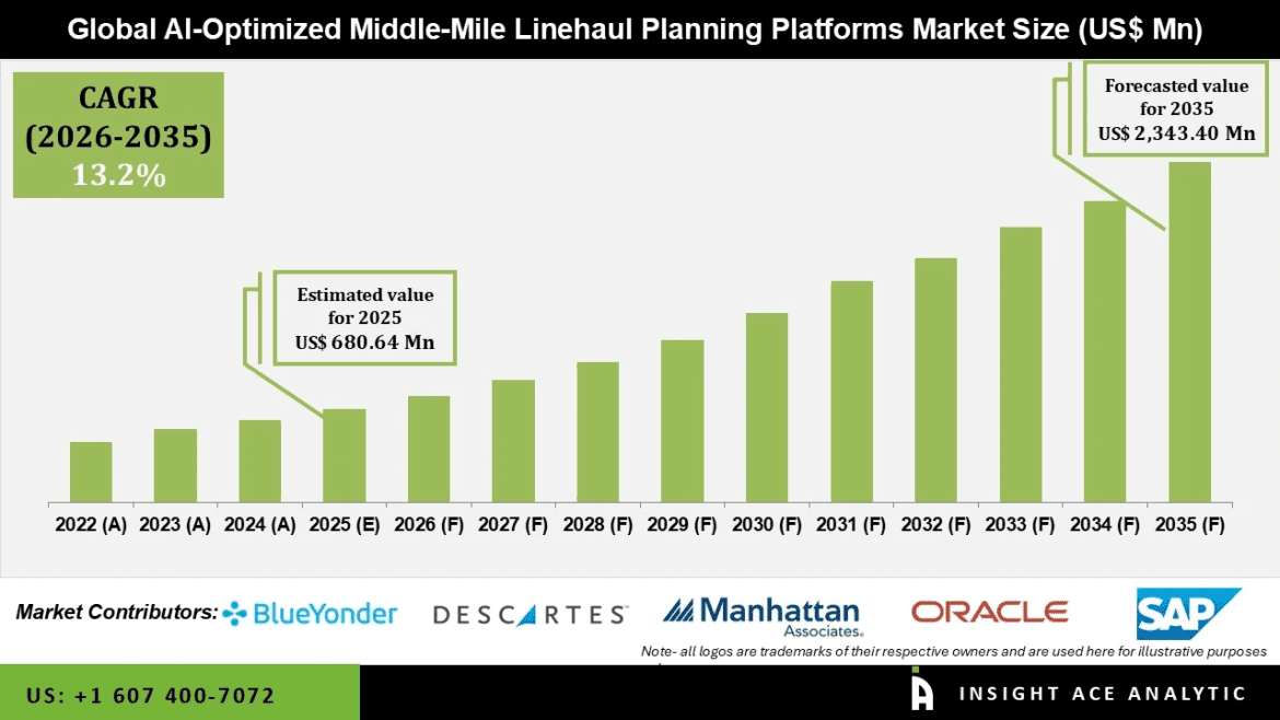 InsightAce Analytic Pvt. Ltd. announces the release of a market assessment report on the “Global AI-Optimized Middle-Mile Linehaul Planning Platforms Market Size, Share & Trends Analysis Report By Technology Type (AI Powered Route Optimization Engines, Analytics & Decision Support Dashboards, Predictive Demand & Capacity Forecasting, and Real Time Load Balancing & Re Planning), End-user (Retail & E Commerce Fulfillment, Third Party Logistics (3PL) Providers, Grocery and Consumer Goods, and Manufacturing & Distribution),-Market Outlook And Industry Analysis 2035”