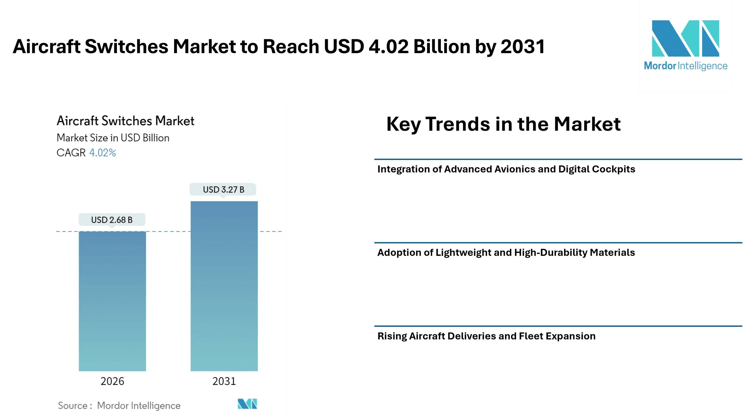 Home Press ReleasesAircraft Switches Market to Reach USD 4.02 Billion by 2031, Supported by Advanced Avionics Integration and Rising Aircraft Production – Mordor Intelligence
