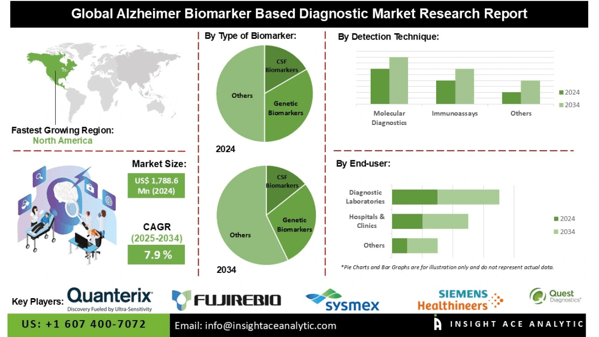 InsightAce Analytic Pvt. Ltd. announces the release of a market assessment report on the “Global Alzheimer Biomarker Based Diagnostic Market Size, Share & Trends Analysis Report By Type of Biomarker (CSF Biomarkers (Amyloid Beta, Tau Protein, Others), Genetic Biomarkers (Apolipoprotein E, Others), and Blood Biomarkers)), By Detection Technique (Molecular Diagnostics, and Immunoassays), By End-user (Hospitals & Clinics, Diagnostic Laboratories, and Others),-Market Outlook And Industry Analysis 2034″