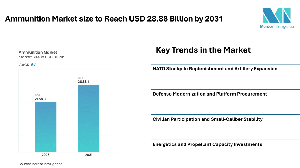 According to Mordor Intelligence, the ammunition market size is expected to grow from USD 21.58 billion in 2026 and is forecasted to reach USD 28.88 billion by 2031, registering a CAGR of 6.00% during the forecast period. Sustained defense procurement programs, artillery stockpile rebuilding initiatives, and modernization plans across allied nations are supporting ammunition market growth.