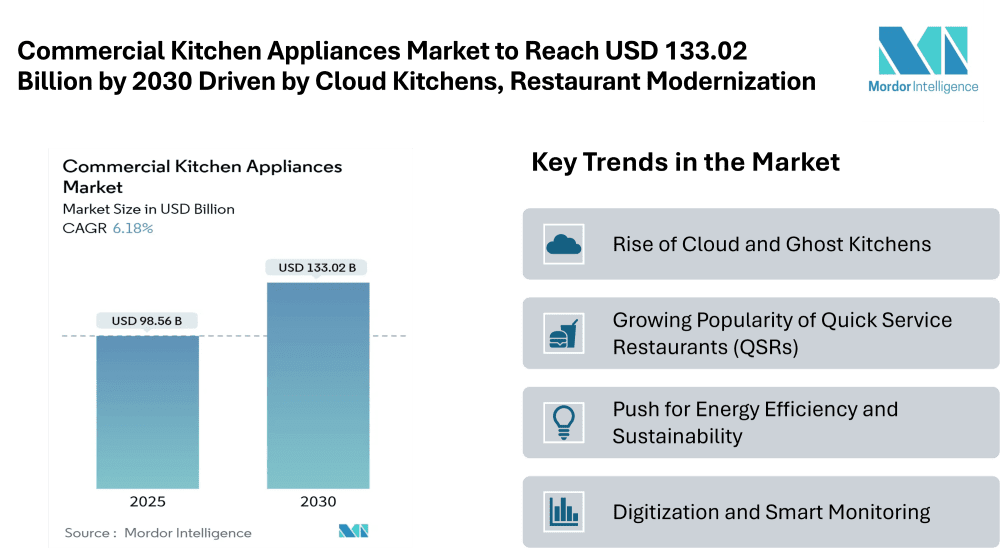 The commercial kitchen appliances market is poised to expand from USD 98.56 billion in 2025 to USD 133.02 billion by 2030, growing at a compound annual growth rate (CAGR) of 6.18%. This growth is being driven by the rising number of food service establishments, the rise of cloud and ghost kitchens, and increasing consumer demand for faster, quality food service across various formats.