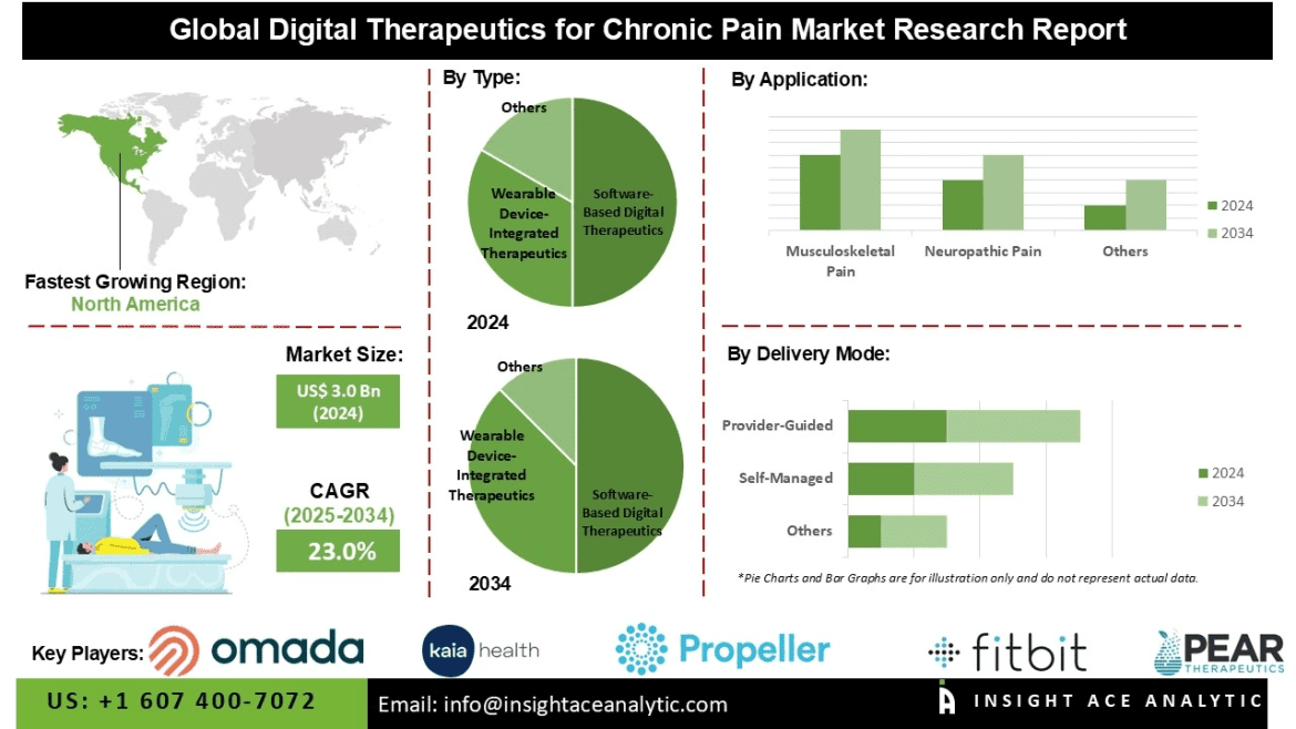 InsightAce Analytic Pvt. Ltd. announces the release of a market assessment report on theGlobal Digital Therapeutics for Chronic Pain Market Size, Share & Trends Analysis Report By Type (Software-Based Digital Therapeutics, Mobile Application Therapeutics, and Wearable Device-Integrated Therapeutics), Delivery Mode (Self-Managed and Provider-Guided), Application (Neuropathic Pain, Musculoskeletal Pain, Fibromyalgia, and Post-Surgical Pain), End-use (Patients and Healthcare Providers),-Market Outlook And Industry Analysis 2034″
