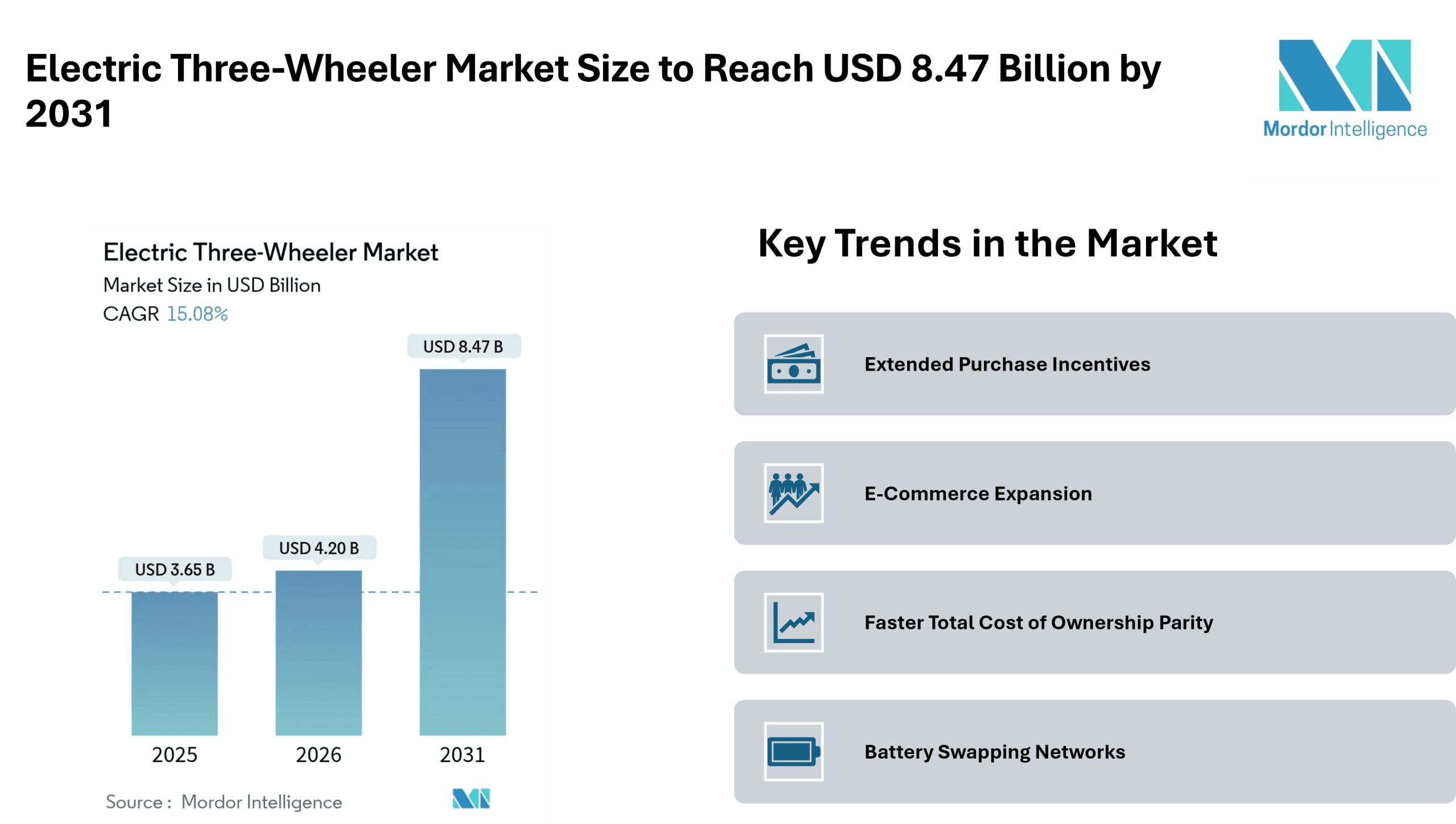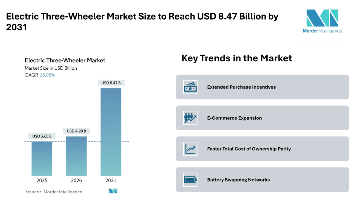 According to Mordor Intelligence, the electric three-wheeler market size was valued at USD 3.65 billion in 2025 and is estimated to grow from USD 4.2 billion in 2026 to reach USD 8.47 billion by 2031, registering a CAGR of 15.08% during the forecast period. The electric three-wheeler market forecast highlights rising demand across passenger and goods carrier applications, supported by policy support, improving battery economics, and expanding charging networks.