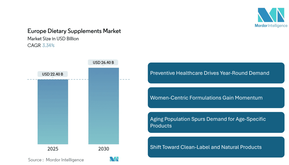 The Europe Dietary Supplements Market Size is expected to grow steadily from USD 22.40 billion in 2025 to USD 26.40 billion by 2030, registering a CAGR of 3.34% during the forecast period (2025-2030). Multiple factors, including increased focus on preventive healthcare, growing consumer demand for clean-label and personalized nutrition, and rising supplement consumption among women and aging populations, are fueling this growth. E-commerce has emerged as a vital sales channel, enabling faster accessibility to a wide variety of supplements across Europe.
