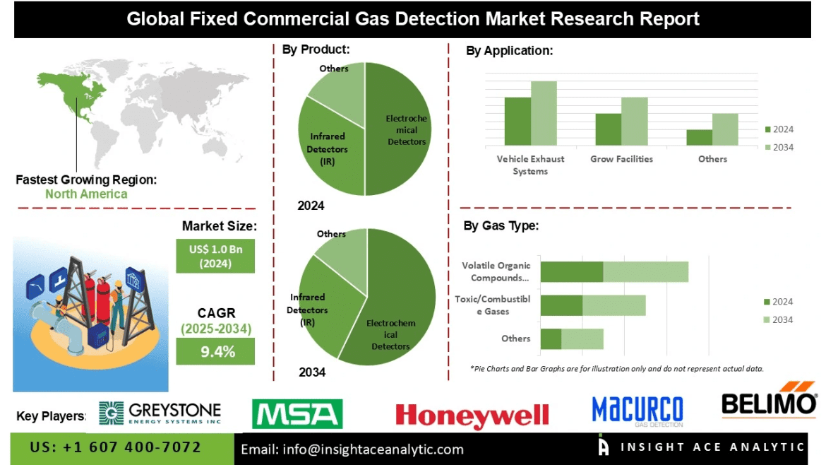 InsightAce Analytic Pvt. Ltd. announces the release of a market assessment report on theGlobal Fixed Commercial Gas Detection Product Market Size, Share & Trends Analysis Report, By Gas Type (Toxic/Combustible Gases, Oxygen (O₂), Volatile Organic Compounds (VOCs), and Others), By Product (Electrochemical Detectors, Catalytic Bead Detectors, Infrared Detectors (IR), and Others), By Application (Boiler Rooms, Vehicle Exhaust Systems, Data Centers, Grow Facilities, Cold Storage Facilities, Battery Storage & Charging Rooms, and Others),-Market Outlook And Industry Analysis 2034″