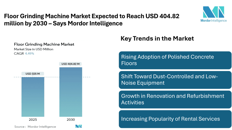 According to Mordor Intelligence, the floor grinding machine market is witnessing steady expansion as construction, renovation, and industrial flooring projects increase across residential, commercial, and industrial settings. The floor grinding machine market size is estimated at USD 325 million in 2025, and is expected to reach USD 404.82 million by 2030, at a CAGR of 4.49%. This growth reflects rising demand for smooth, durable, and aesthetically finished floors, particularly in warehouses, shopping complexes, manufacturing plants, and public infrastructure.