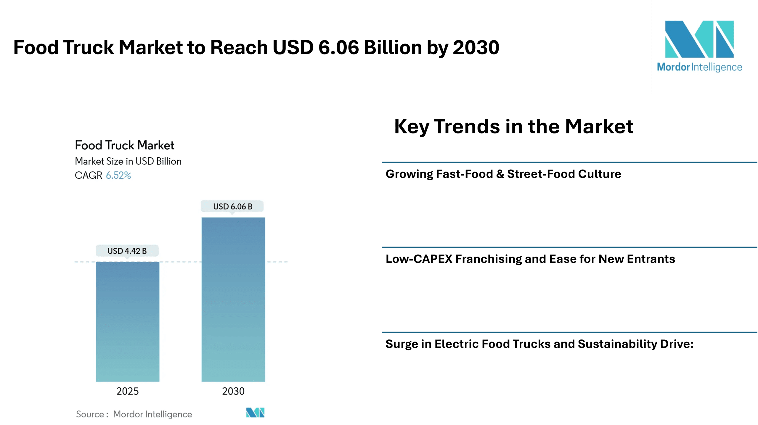 Low-CAPEX Franchising and Ease for New Entrants: Compared to opening a traditional brick-and-mortar restaurant, launching a food truck requires lower initial investment. This makes the food truck market accessible to entrepreneurs and small-business owners.
