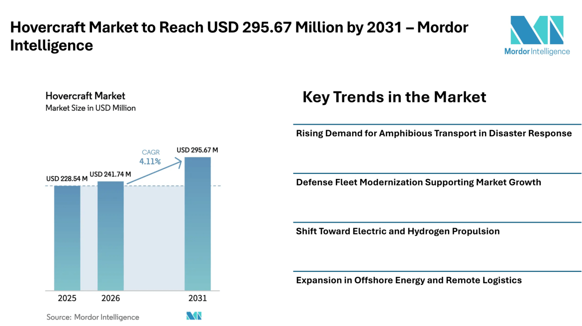 According to Mordor Intelligence, the hovercraft market size is expected to grow from USD 241.74 million in 2026 and reach to USD 295.67 million by 2031. This market growth reflects a combination of defense modernization programs, increasing need for amphibious transport, and rising adoption in emergency response operations.
