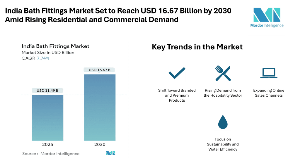 The India Bath Fittings Market is witnessing steady growth, with its size projected to increase from USD 11.49 billion in 2025 to USD 16.67 billion by 2030, registering a CAGR of 7.74% during the forecast period. India Bath Fittings Market expansion is driven by the rise in urban housing projects, higher disposable incomes, and growing interest in modern, functional, and aesthetically appealing bathroom designs.
