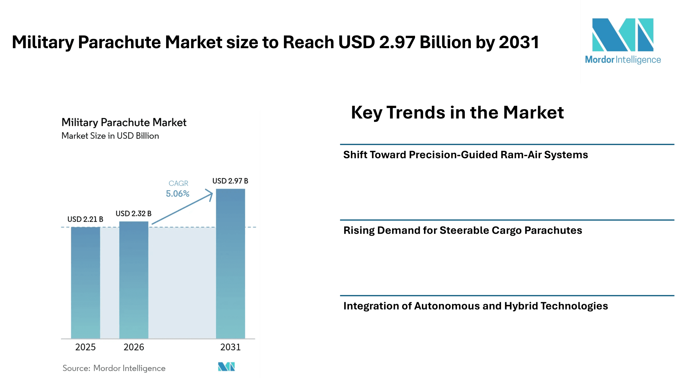 According to Mordor Intelligence, the military parachute market size was valued at USD 2.21 billion in 2025 and is projected to grow to USD 2.97 billion by 2031, reflecting consistent military parachute market growth during the forecast period. This upward trajectory reflects increased procurement cycles supported by rising defense budgets across NATO countries and the Indo-Pacific region.