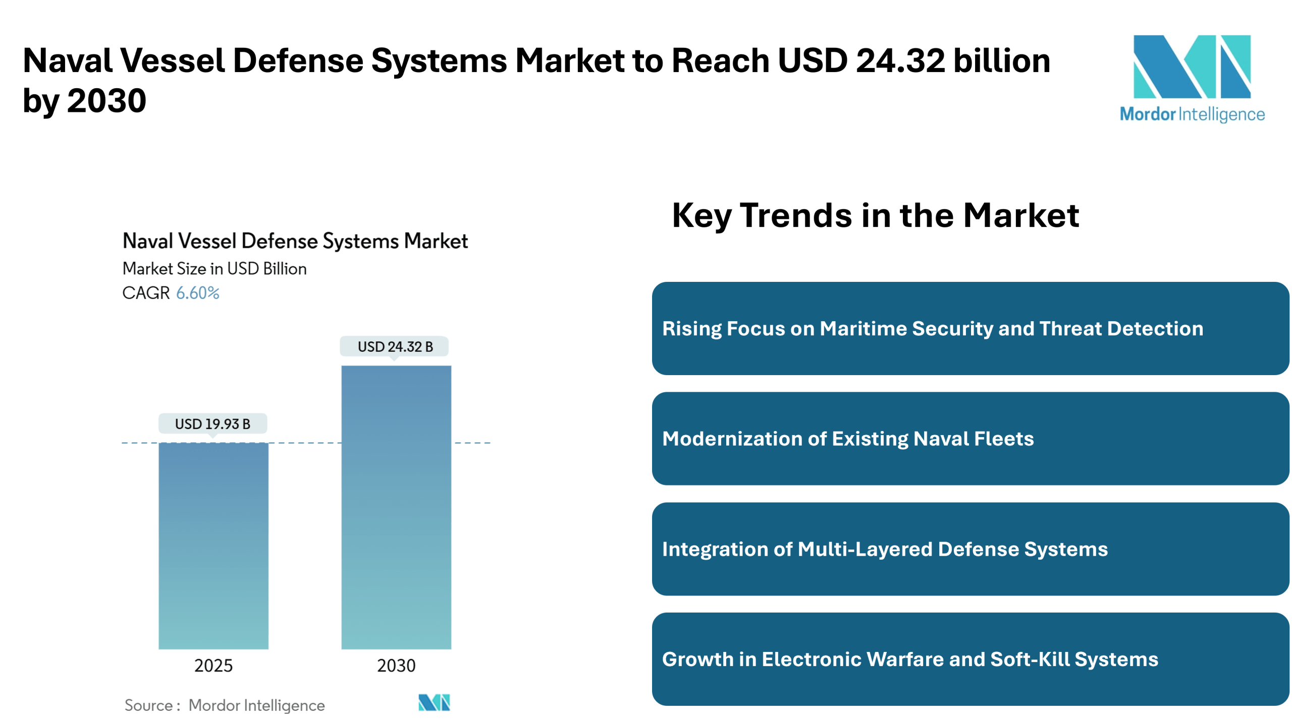 The Naval Vessel Defense Systems Market is projected to grow from an estimated USD 19.93 billion in 2025 to USD 24.32 billion by 2030, registering a CAGR of 6.60% over the forecast period from 2025 to 2030.