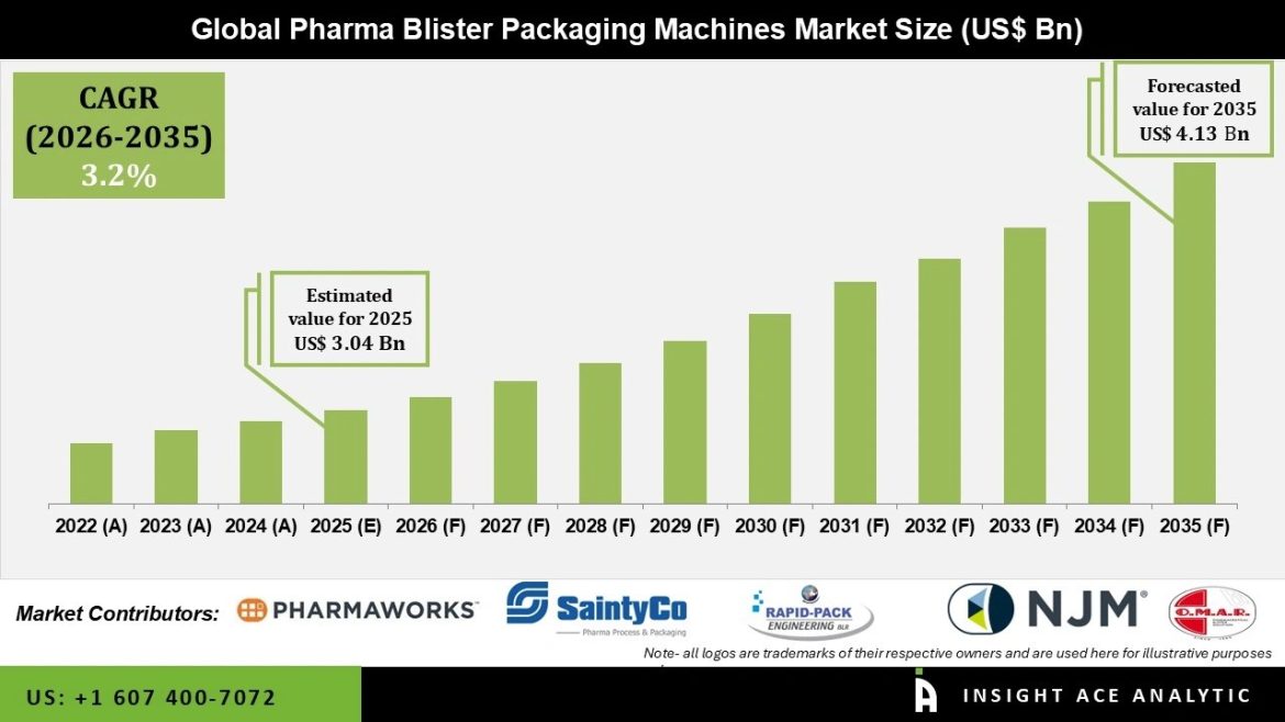 Pharma Blister Packaging Machines Market Size is valued at USD 3.04 Bn in 2025 and is predicted to reach USD 4.13 Bn by the year 2035 at a 3.2% CAGR during the forecast period for 2026 to 2035.