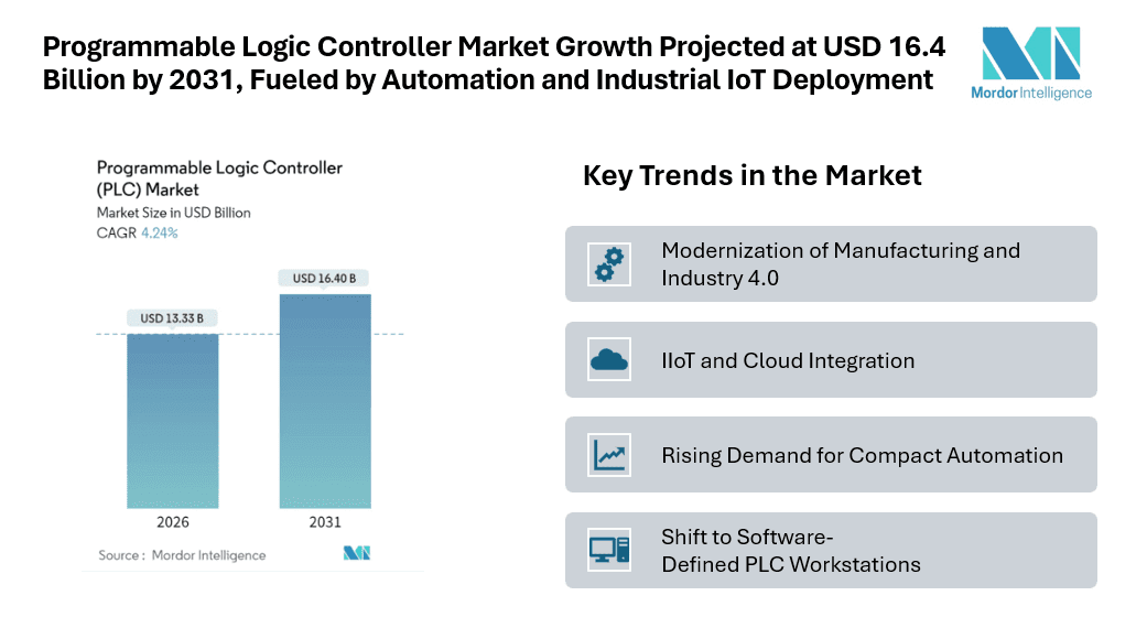The global Programmable Logic Controller (PLC) Market is witnessing steady growth, with market size expected to rise from USD 13.33 billion in 2026 to USD 16.4 billion by 2031.