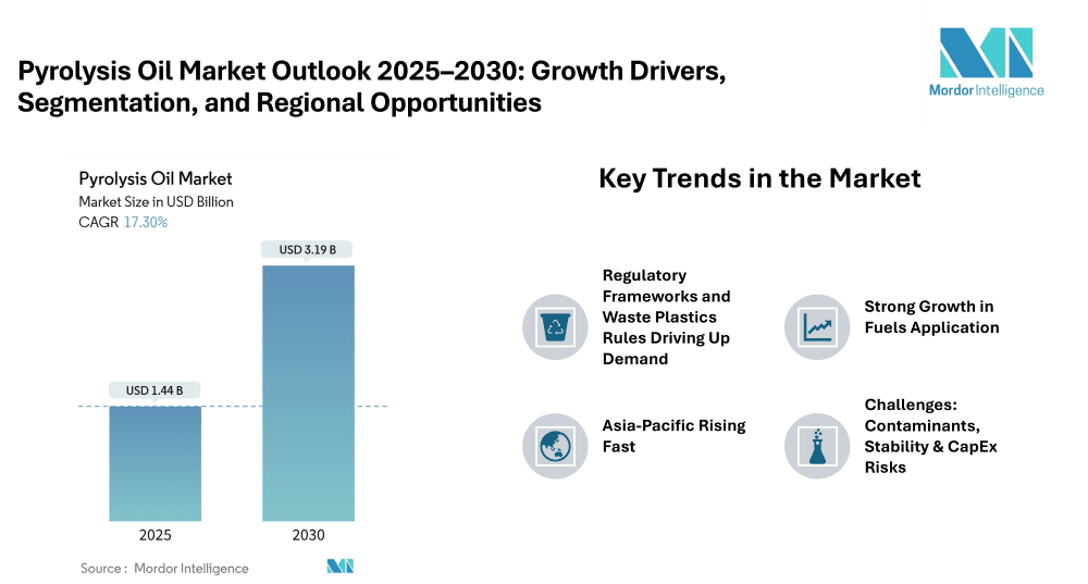 Pyrolysis Oil Market is on track for significant expansion, with estimates placing its global value at USD 1.44 billion in 2025, rising to USD 3.19 billion by 2030, according to a recent report. This represents a compound annual growth rate (CAGR) of approximately 17.30% over the 2025-2030 forecast period.