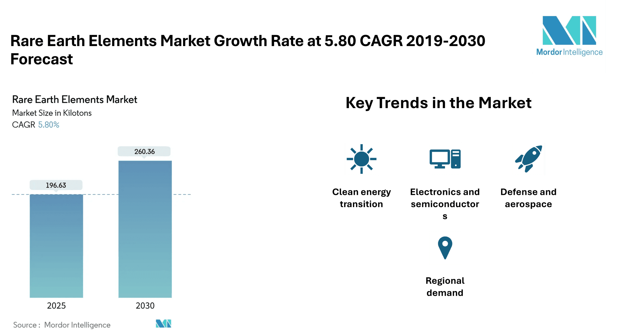 Rare Earth Elements Market plays a vital role in powering modern technologies across clean‑energy, electric vehicle, and consumer electronics sectors. According to a report by Mordor Intelligence, the market stood at 196.63 kilotons in 2025 and is expected to grow to 260.36 kilotons by 2030, reflecting a compound annual growth rate (CAGR) of 5.80% over the forecast period.