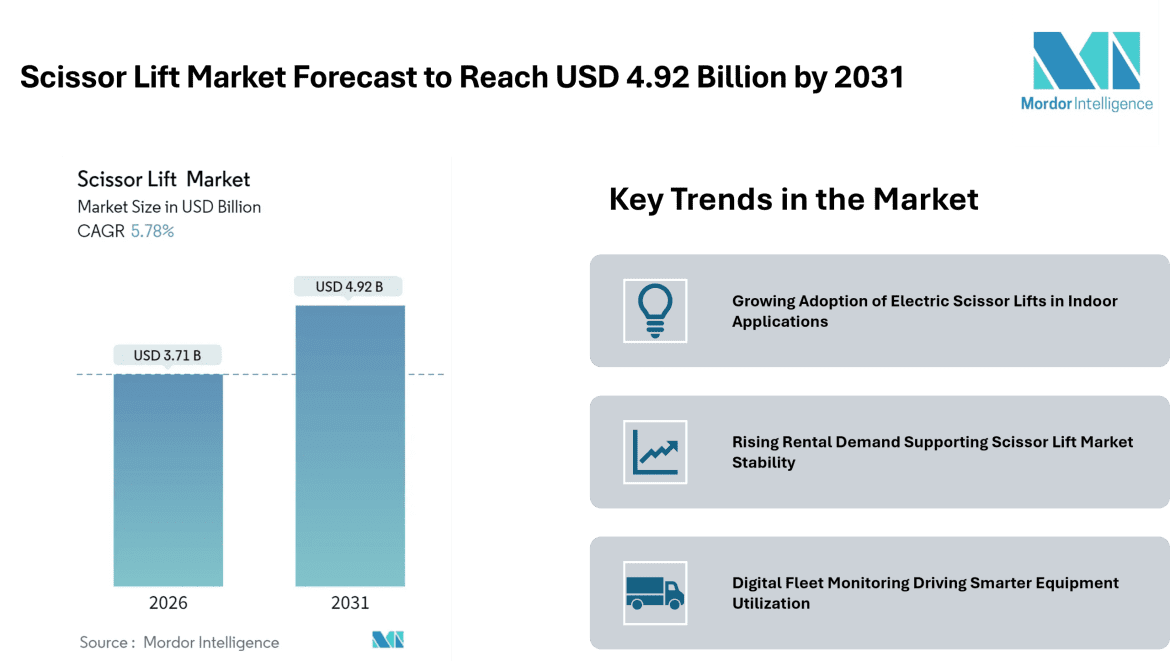 According to Mordor Intelligence, the scissor lift market size at USD 3.71 billion in 2026, and is projected to achieve USD 4.92 billion by 2031. This outlook reflects consistent scissor lift market growth supported by infrastructure development, warehouse expansion, and the growing preference for rental-based access equipment.