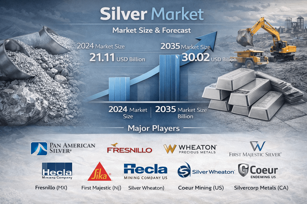 According to the global silver market was valued at USD 21.11 billion in 2024 and is projected to grow from USD 21.8 billion in 2025 to USD 30.02 billion by 2035, advancing at a compound annual growth rate (CAGR) of 3.25% during the forecast period from 2025 to 2035.