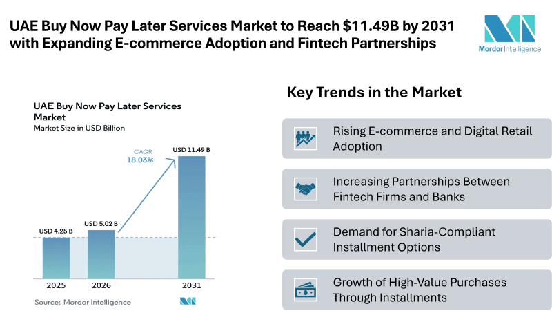 According to Mordor Intelligence, the UAE buy now pay later services market size was valued at USD 4.25 billion in 2025 and is estimated to grow to USD 5.02 billion in 2026, reaching USD 11.49 billion by 2031, growing at a CAGR of 18.03%. The market continues to expand as digital payments and flexible financing options gain traction among consumers and merchants across the country