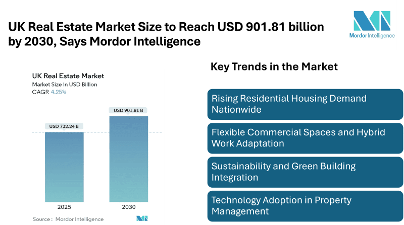 According to Mordor Intelligence, the UK Real Estate Market size is estimated at USD 732.24 billion in 2025 and is expected to reach USD 901.81 billion by 2030, at a CAGR of 4.25%. The outlook for the UK real estate market share reflects continued expansion in urban hubs while supporting regional development projects, positioning the sector as a key contributor to the overall real estate landscape in the UK.