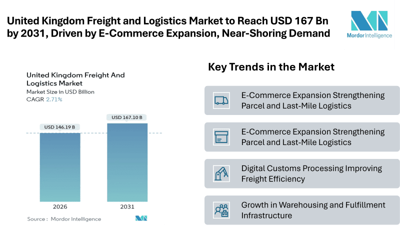 According to Mordor Intelligence, the United Kingdom freight and logistics market size is projected to increase from USD 142.33 billion in 2025 to USD 146.19 billion in 2026, reaching USD 167.1 billion by 2031, registering a CAGR of 2.71%. This steady trajectory highlights the strength of the United Kingdom freight and logistics industry, which continues to adapt to changing trade patterns, e-commerce demand, and digital supply chain management. The sector plays a vital role in supporting domestic production, international trade, and retail distribution, ensuring consistent movement of goods across regional and global networks.