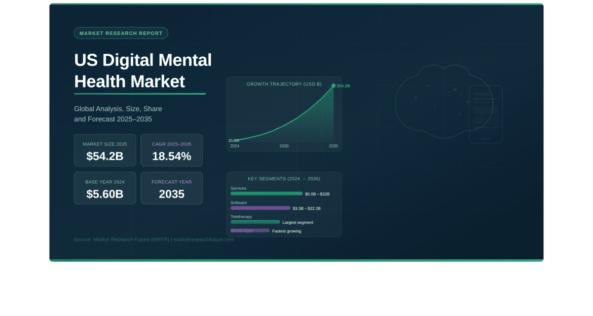 Pune, India — The US Digital Mental Health Market is on an exceptional growth trajectory, according to the latest US Digital Mental Health Market report published by Market Research Future (MRFR). Valued at USD 5.60 billion in 2024, the market is projected to grow at a remarkable compound annual growth rate (CAGR) of 18.54% from 2025 to 2035, reaching USD 54.2 billion by 2035. This explosive expansion positions the US as the world’s most advanced and investment-intensive digital mental healthcare ecosystem — a trend that resonates strongly with the broader Longevity Market size narrative, where mental wellness has emerged as a defining pillar of healthy aging and life extension strategies worldwide.